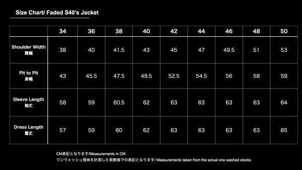 - Because this product is made from raw fabric and faded, the sizing is smaller. We recommend going up one to two sizes compared to regular S40s.