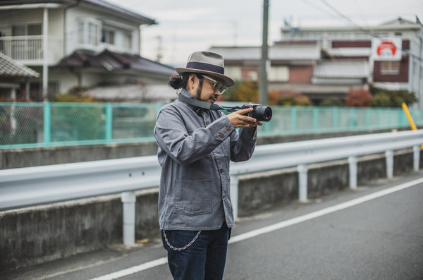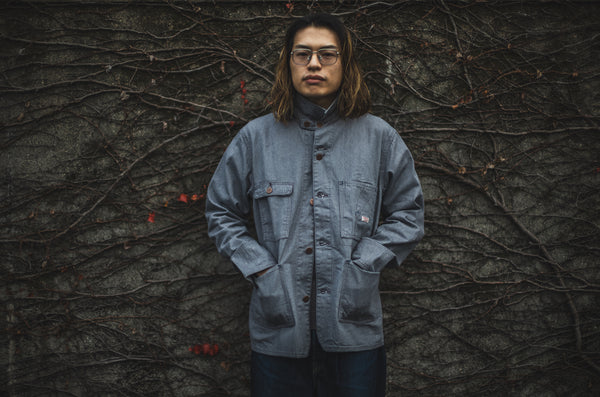 We make in gray denim this time. The fabric is 10oz. The weft is made from light gray denim rope-dyed with sulfur dyes and has a neppy weft. Like indigo, the color will fade like regular indigo jeans.