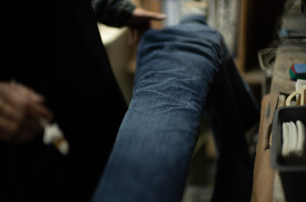 While the fading process involves a wide range of steps, the first step is creating the whisker pattern (see photos 22 and 23), which greatly influences the impression of the honeycomb and whiskers. This is a process that can only be done by two people, including RYOTA, at Bito, which also handles processing for world-renowned luxury brands. The next step is to repeat the process of scraping (giving the overall look) → grinding (pinpoint processing on seams, etc.) → washing multiple times, gradually narrowing down the desired look by hand.