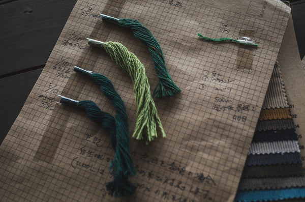 The wefts looked more grey than undyed and we assume that the grey color might have been transferred from the indigo on the warps over times but in order to get this grey-ish color on the whole, we have dyed the wefts in grey.