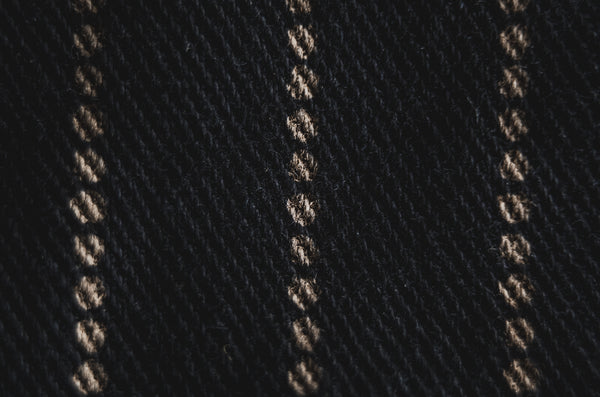 This black fabric is discharge-dyed in a striped pattern, replicating the production method used around 1920. The fabric is left-hand twill to make the pattern more clearly visible for discharge printing, and the slightly uneven stripe pattern unique to discharge printing is its charm. It is a great fabric that has a work-like feel but also a slightly urban impression.